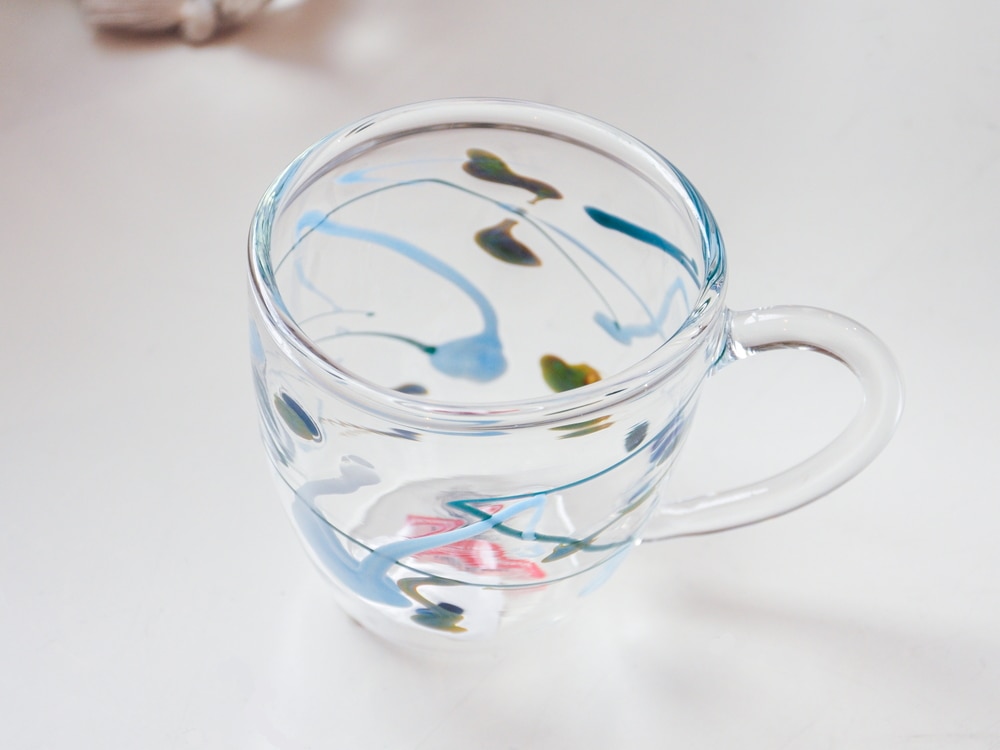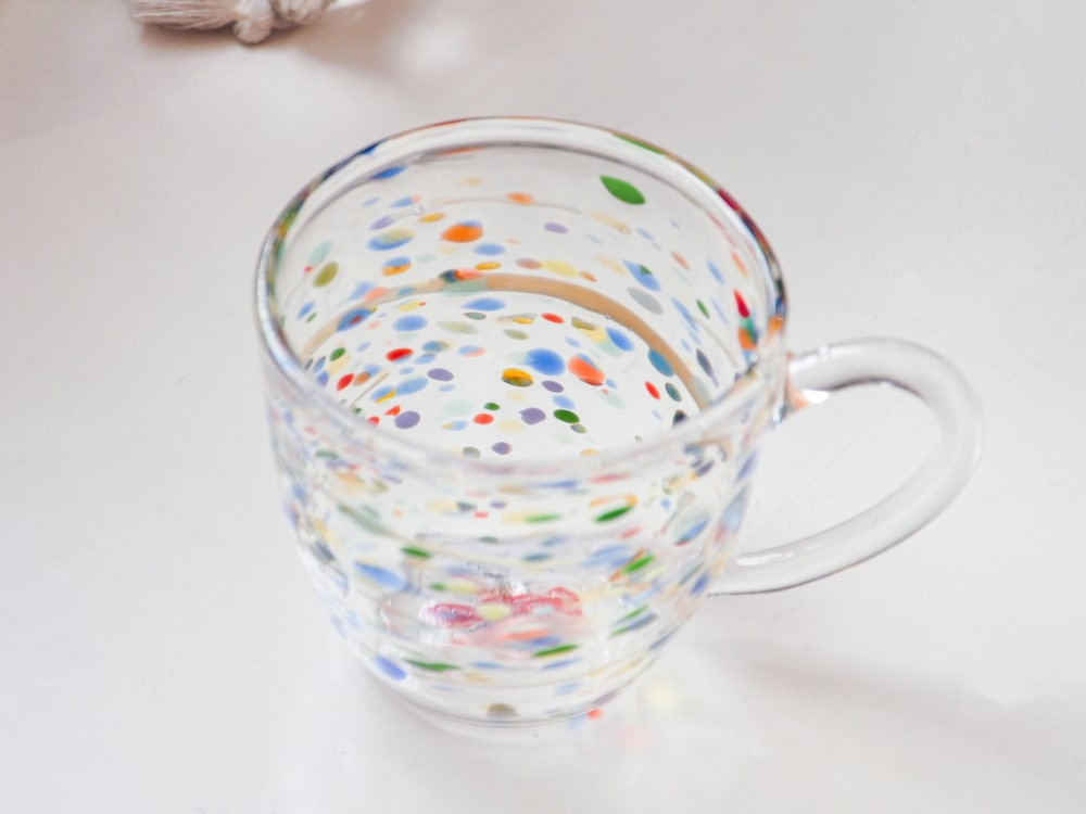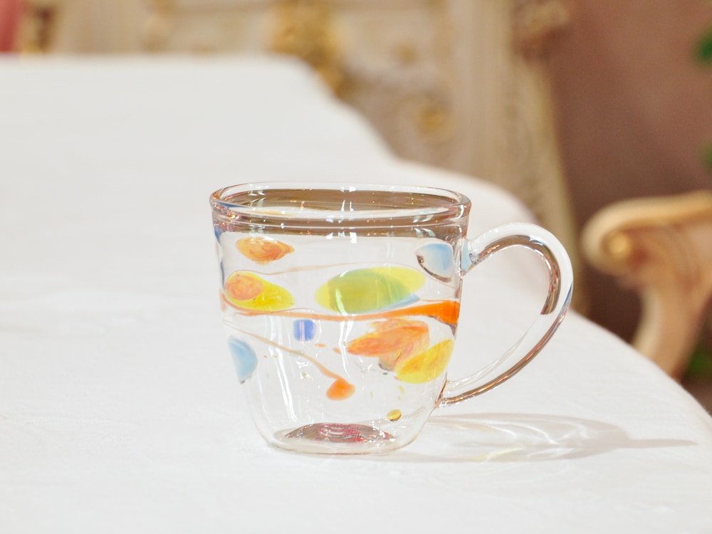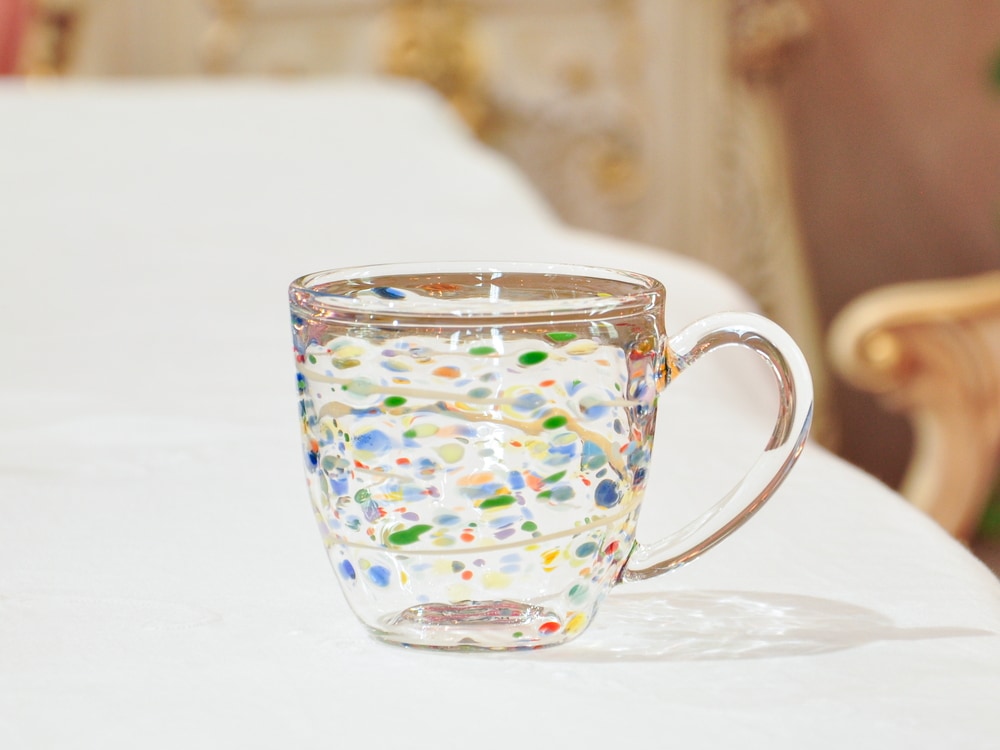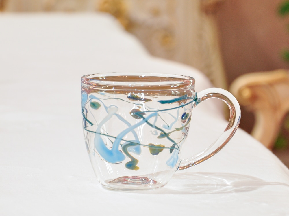 お飲み物の色も楽しめる耐熱性のマグカップ。