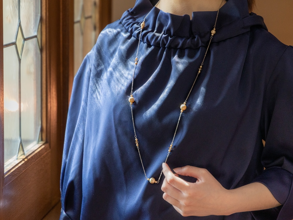 「月の雫」とも称されるパールの美しさ。 硝子を核とした原珠に、真珠の美しさをぎゅっと閉じ込めた、イミテーションパールのネックレスです。