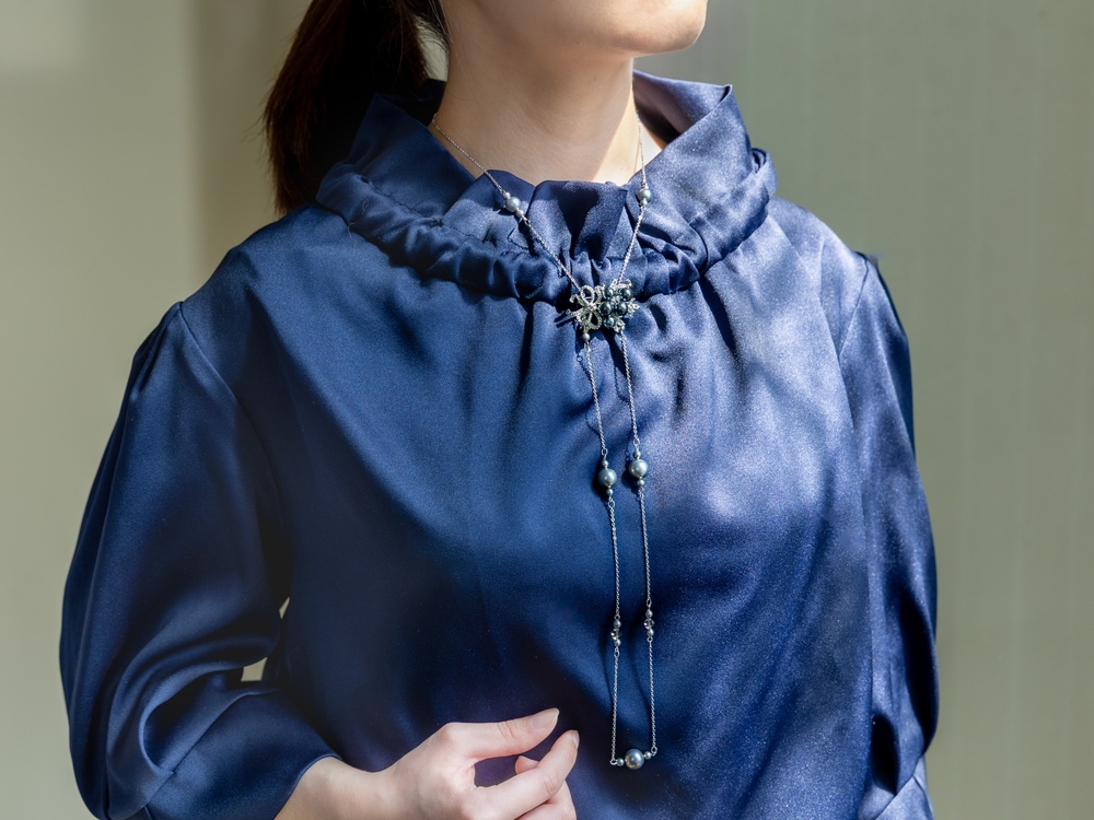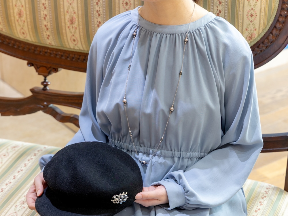 ガラスパールブローチ と揃えた姿も魅力的。 セットでのコーディネートはもちろん、ロングネックレスはブローチで留めるなど、遊び心あるお洒落を愉しめます。