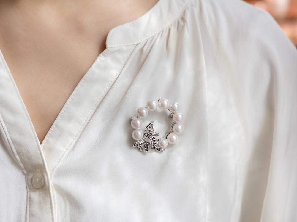 「月の雫」とも称されるパールの美しさ。 硝子を核とした原珠に、真珠の美しさをぎゅっと閉じ込めた、イミテーションパールのブローチです。