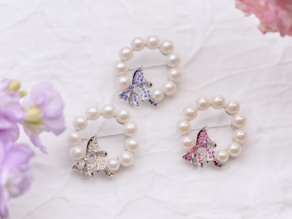 陽光を受けて柔らかな輝きを放つガラスパール。 上品なホワイトのガラスパールが、思わず目に留まってしまう華やかさを演出します。 ブローチはシーンを問わずお使い頂きやすいラウンド型に、リボンをかたどったビジューをプラス。 ビジューは「ローズピンク」「タンザナイト」「クリア」の3色をご用意致しました。