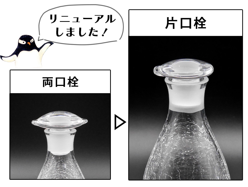 氷の華のお醤油差しの蓋がリニューアル! 従来の両口栓から、片口栓タイプに変化いたしました。 ※桜色のみ両口タイプのものを数量限定で販売しております。