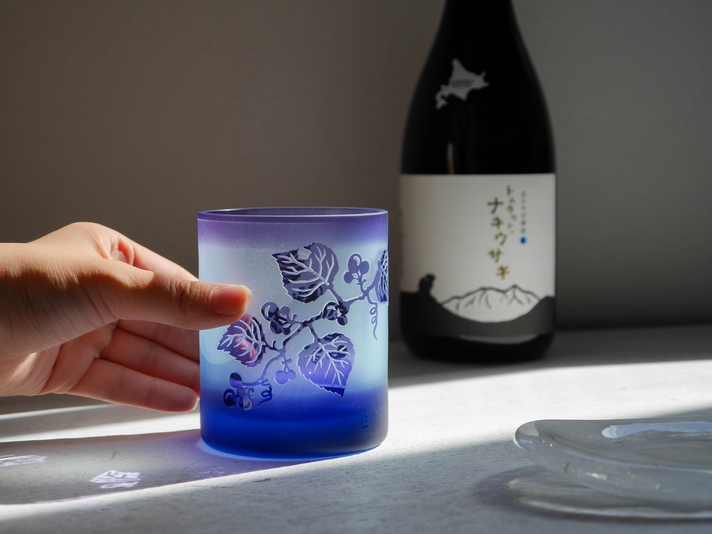 砂を吹きつけて硝子を削るサンドブラスト技法で「野葡萄」柄を彫り込みました。