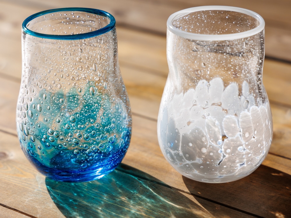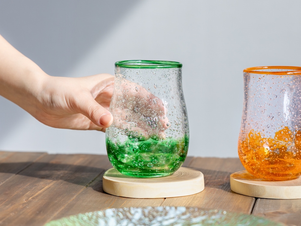 手作業で製作した硝子には、同じ商品でも重さや色・柄の不揃い、空気の泡、製作上の跡なども残っております。