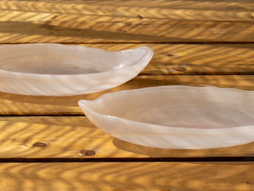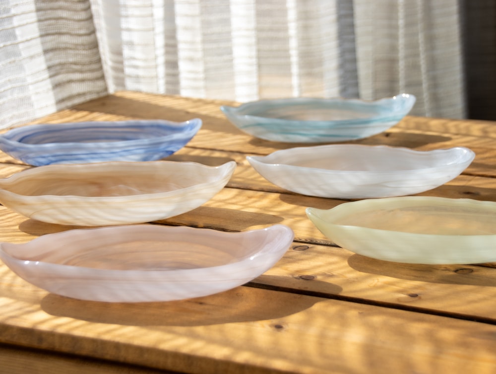 手作業で製作した硝子には、同じ商品でも重さや色・柄の不揃い、空気の泡、製作上の跡なども残っております。