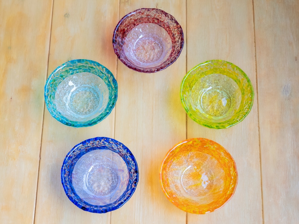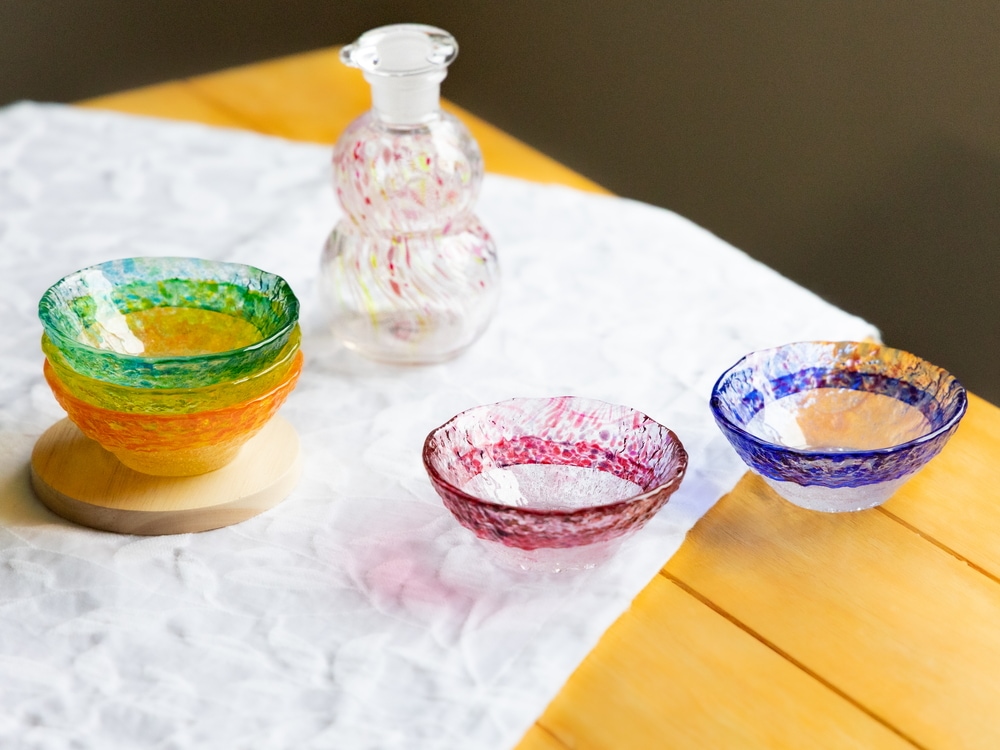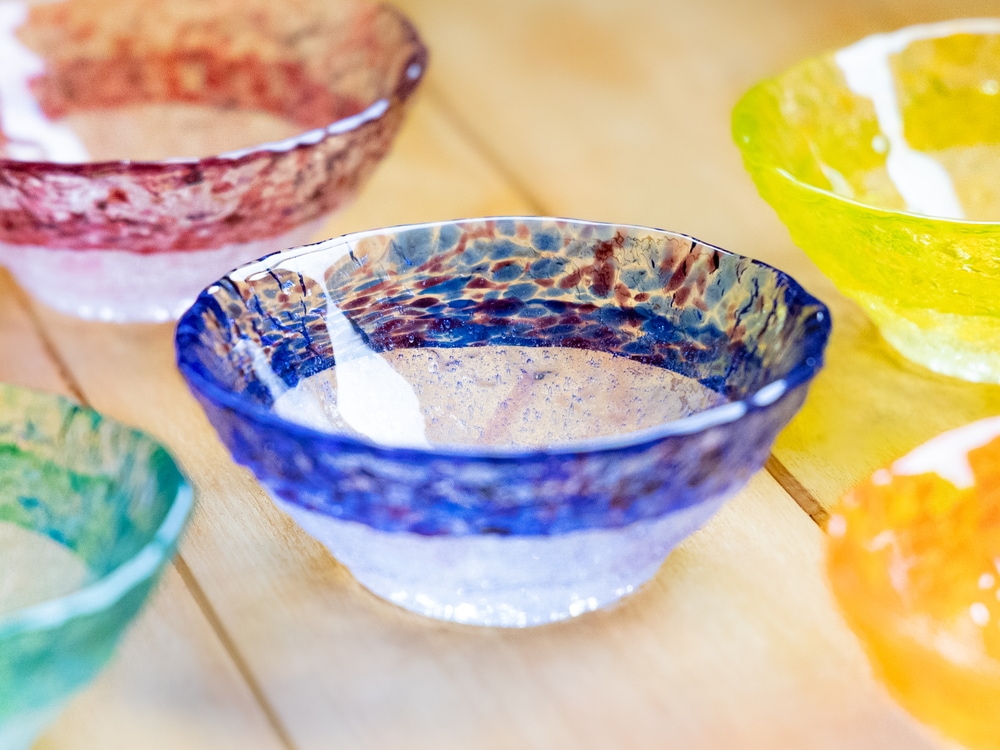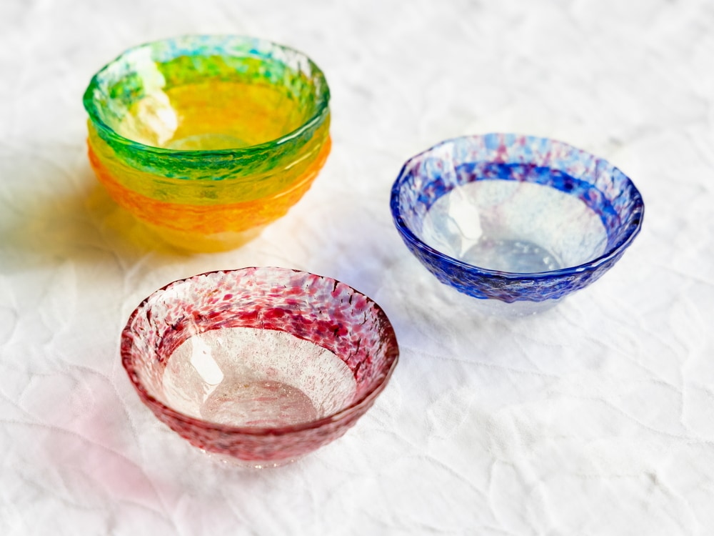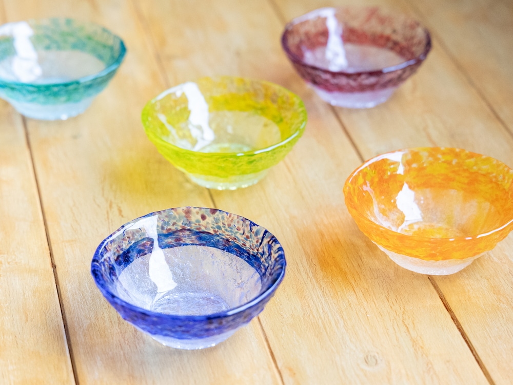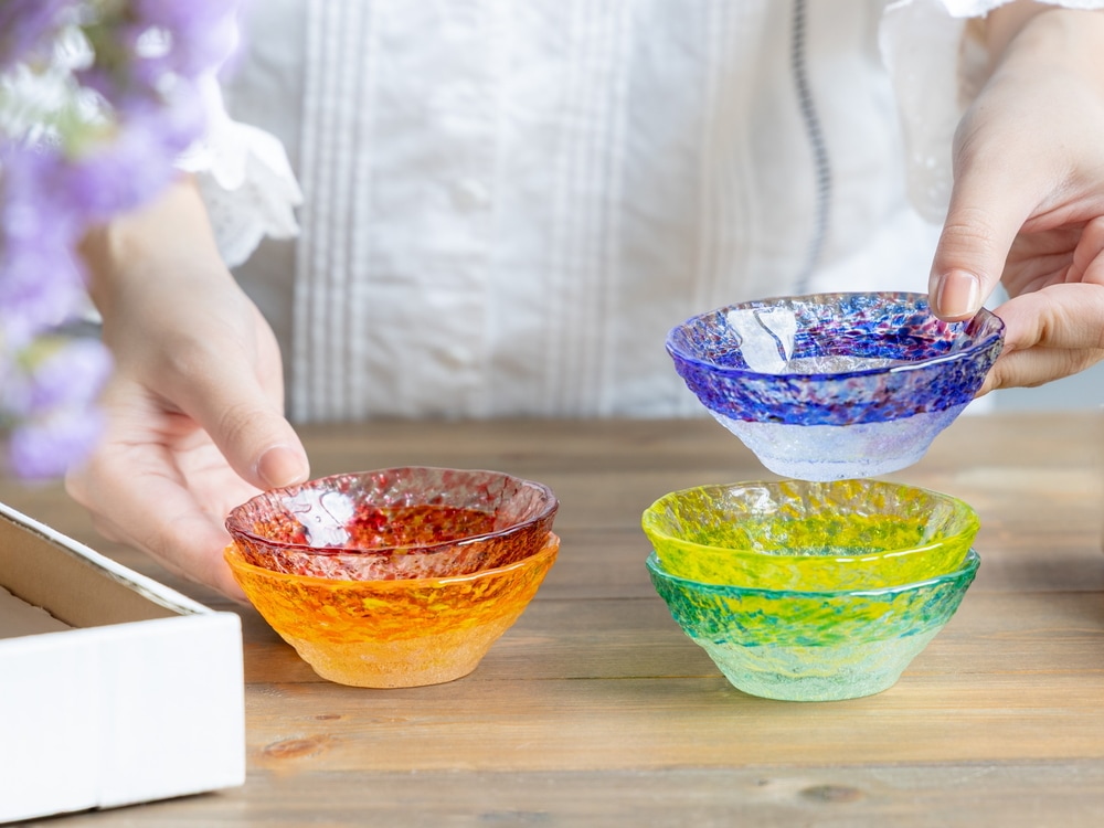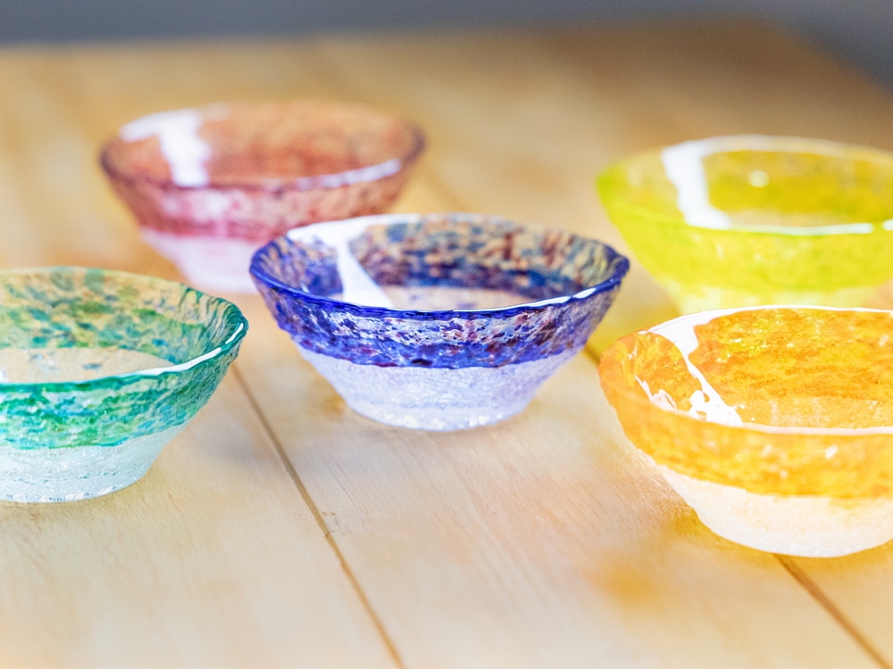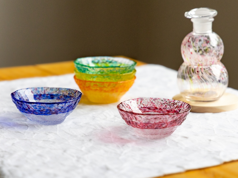手作業で製作した硝子には、同じ商品でも重さや色・柄の不揃い、空気の泡、製作上の跡なども残っております。